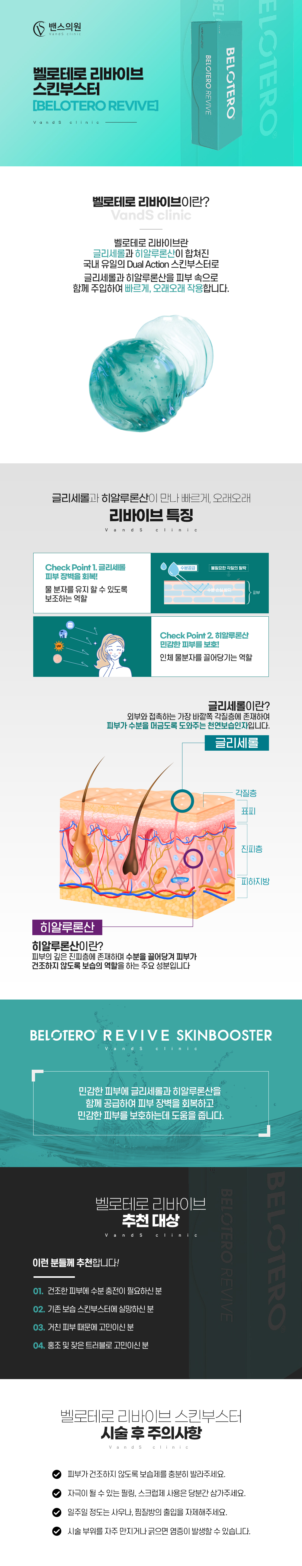 벨로테로 리바이브 스킨부스터는 피부 진피층에 주입하는 의료기기로 멀츠 고유의 동적 가교 기술(DCLT)을 적용한 다밀도 매트릭스(CPM) 히알루론산(20mg/mL)이 피부 조직에 균일하게 밀착해 자연스러운 시술 효과를 나타내며, 천연보습인자인 글리세롤은 히알루론산이 끌어당긴 물 분자를 유지할 수 있도록 보조하는 역할을 합니다.